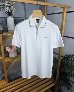 Hugo_Boss White Embossed Logo Print Premium Collar Neck Polo T-shirt F1691-WH