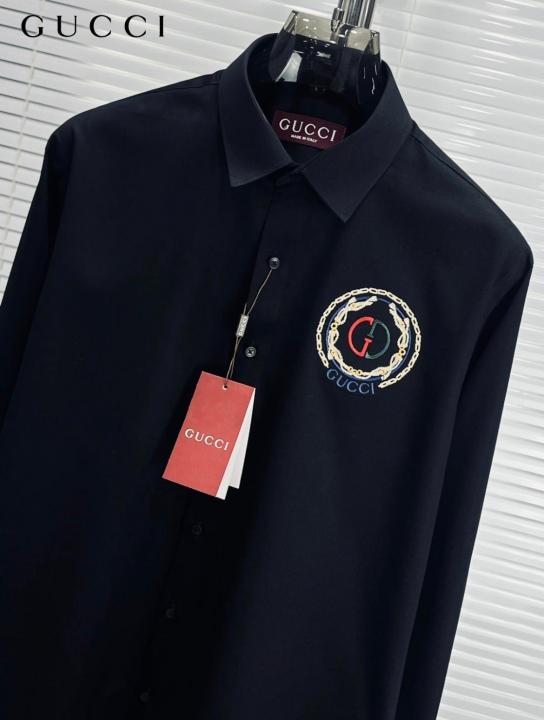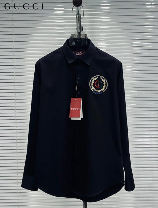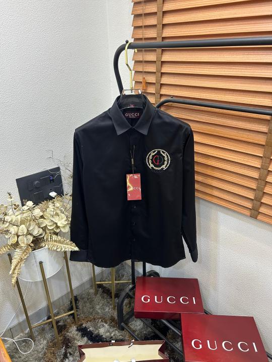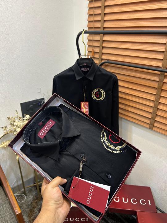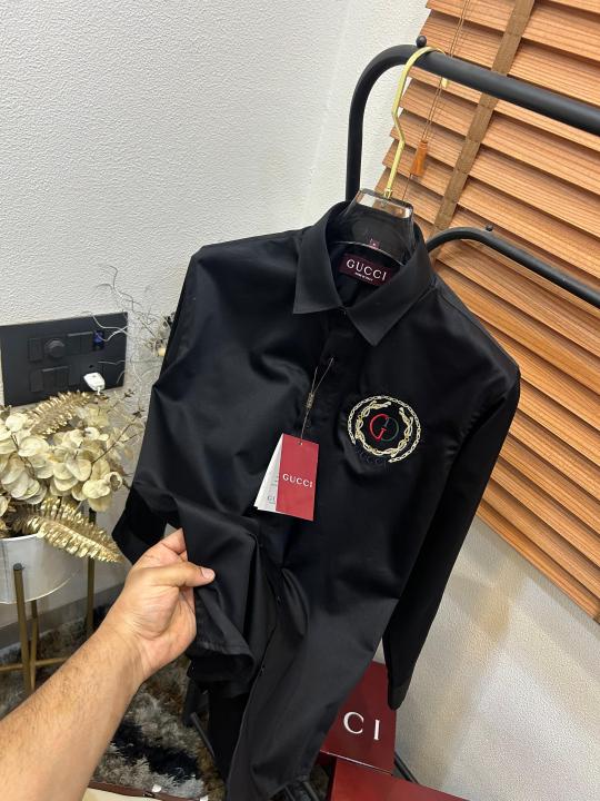 Gucc_i GG Embroidered Black Imported Very Premium Cotton Partywear Shirt With Og Box And Bag (DN 516)